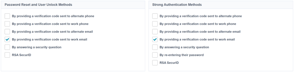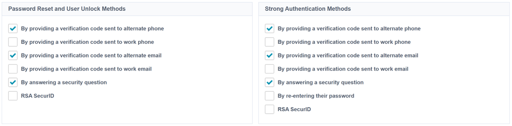 Note that for both the Password Reset/User Unlock and Strong Authentication methods, at least one option must be selected.