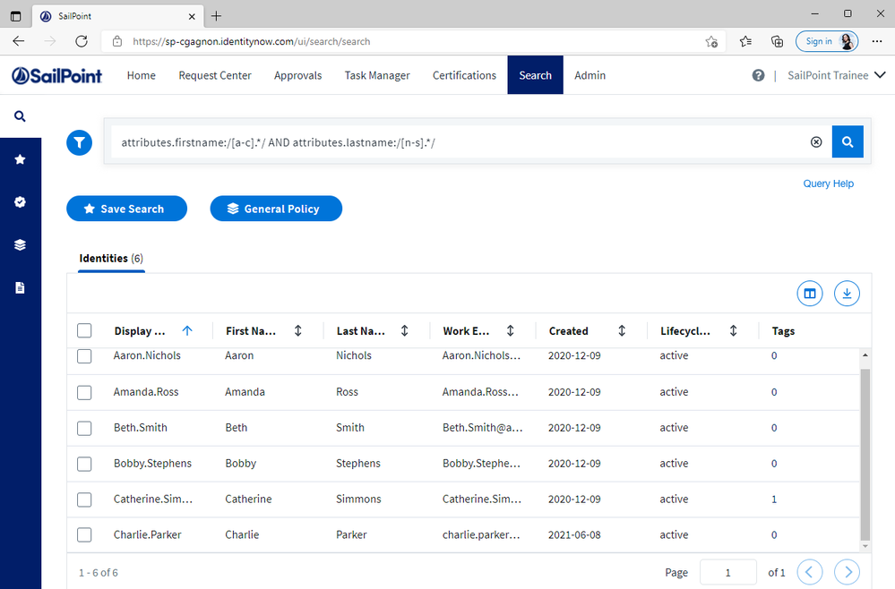 But what if you wanted to find all identities whose first name starts with the letters "a - c"? That can't be done with the * wildcard in search, but you can use regex to do that. You can specify a range of characters for the first character in the regex search pattern as shown below. Within search, all regex patterns must be set off with the "/" character. The "." represents any character, and the "*" represents the preceding character zero to many times.