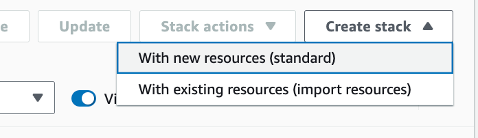 1. Open the CloudFormation console. 2. In the top right corner click the Create Stack button and choose With new resources (standard). |