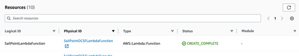 1. From the CloudFormation stacks screen click on the name of your stack and select the Resources tab. 2. Click the link to SailPointOCSFLambdaFunction in the Physical ID column. |