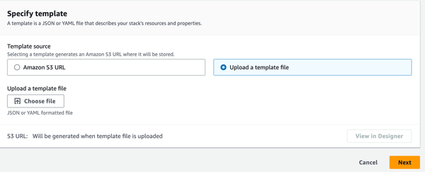 3. On the Specify template section choose Upload a template file. 4. Click the Choose file button and browse to the cloudformation.yaml file provided, then click Next. |