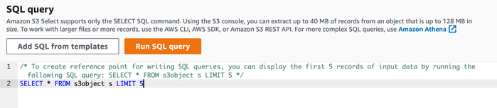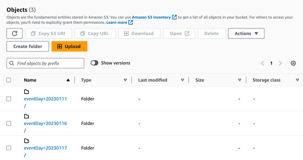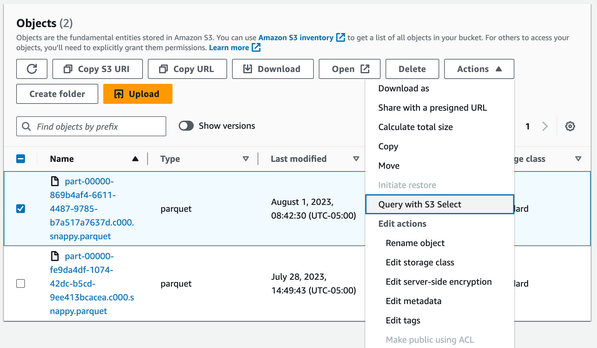 | 5. Check one of the eventDay folders for the parquet file data left by the script. Select the checkbox next to one parquet file, then select Query with S3 select from the Actions menu. | |