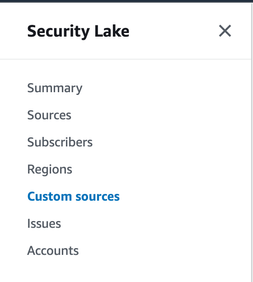 1. Open the Amazon Security Lake console 2. Click on Custom Sources in the left navigation menu. |